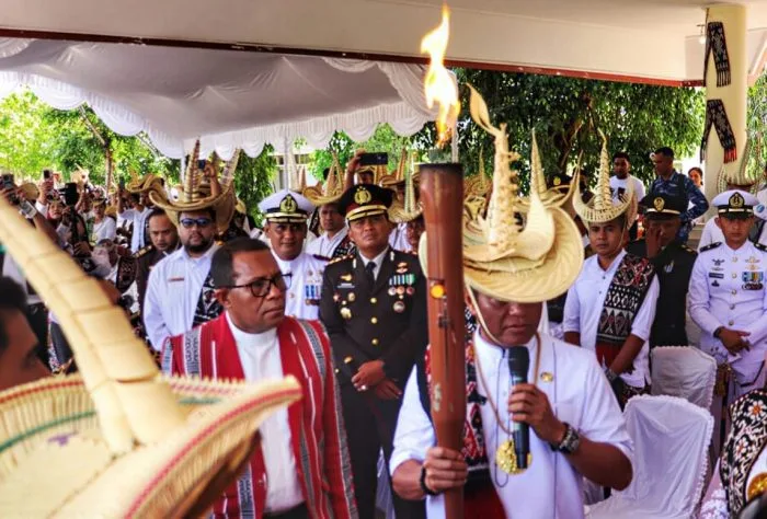 Bupati Rote Ndao menerima Obor Perdamaian GMIT 2026 pada Upacara Peringatan HUT Kabupaten Rote Ndao ke-24
